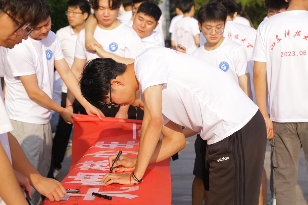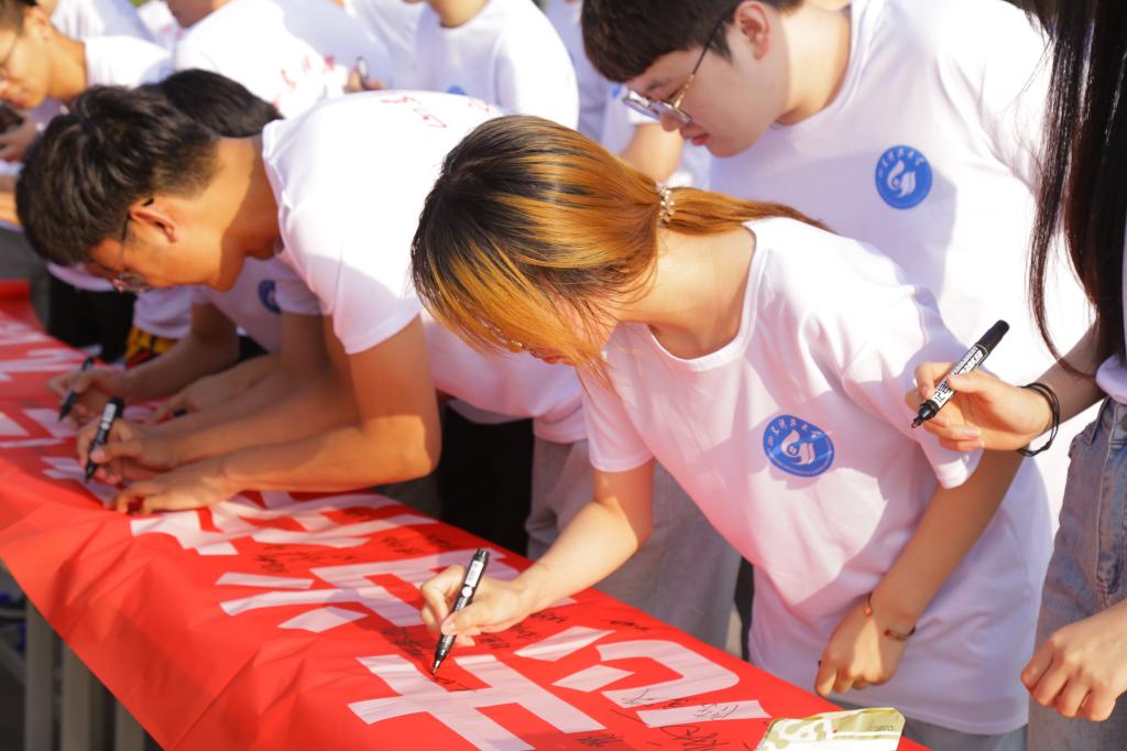 宣誓完毕,全体毕业生依次在纪念横幅上签名,字里行间渗透的是他们要回报社会、回报母校的赤子之心。