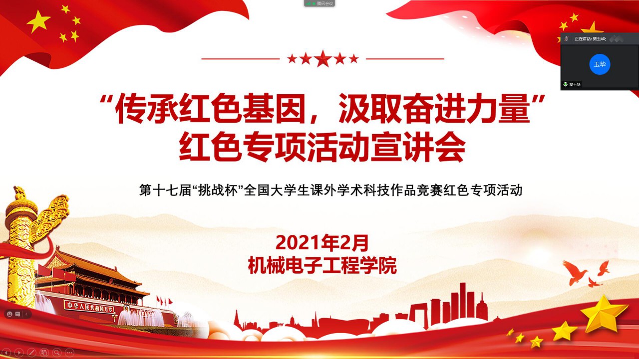 点击:为迎接中国共产党建党100周年,传承红色基因,引导学生在实践中接受红色教育,2月20日,成人卡通 积极响应“挑战杯”竞赛组员会和学校的号召,举办了“传承红色基因,汲取奋进力量”红色专项活动宣讲会。成人卡通 团委书记樊玉华,团委老师王玉鹏出席了此次会议,全体团支部书记及各社会实践项目负责人参加,宣讲会由团委老师苗成旭主持。