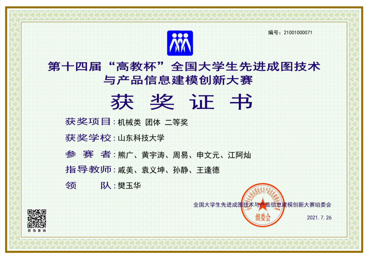 点击:近日,由全国大学生先进成图技术与产品信息建模创新大赛组委会、中国图学学会制图技术专业委员会、中国图学学会产品信息建模专业委员会、西南交通大学共同主办的第十四届“高教杯”全国大学生先进成图技术与产品信息建模创新大赛在西南交通大学顺利落下帷幕。经过激烈角逐,成人卡通 青岛校区荣获团体一等奖1项、二等奖1项、三等奖2项,个人一等奖24项、二等奖5项、三等奖6项,其中成人卡通 荣获团体一等奖1项、二等奖1项、三等奖1项,个人一等奖24项、二等奖3项、三等奖1项。由王思亮、贺明、孙学政、李海龙、崔洁旭组成的机械类代表队(指导老师:杨德星、王瑞、顾东明,领队:王玉鹏)获得机械类团体一等奖,这是成人卡通 连续七年获得机械类团体一等奖。同时由熊广、黄宇涛、周易、申文元、江阿灿组成的机械类代表队(指导老师:戚美、袁义坤、孙静、王逢德,领队:樊玉华)获得机械类团体二等奖。成人卡通 还获得了制图基础知识一等奖1项、二等奖1项、三等奖1项,3D打印二等奖1项,inspire优化创新设计三等奖一项。同时,杨德星、王瑞、顾东明被评为“优秀指导教师”。