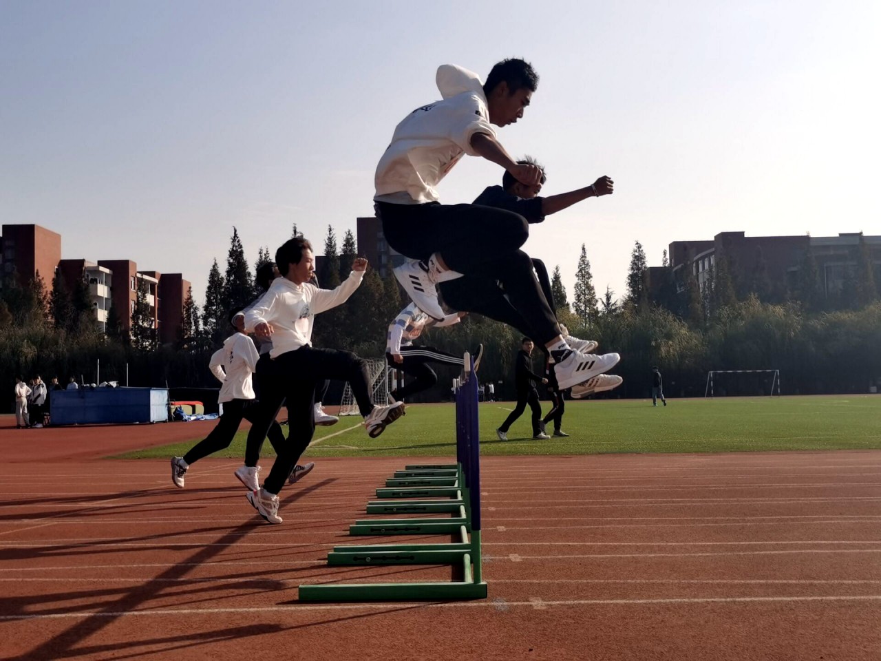 运动场上,跨栏运动员灵巧速跑,当其飞跃之时,栏杆也不能阻挡他们勇往直前的意志;短跑运动员迈着矫健的步伐在观众们的竭力呼喊中奋力冲刺,去迎接终点处属于他们的掌声;接力运动员以接力棒承载希望,以每一次奔跑的脚印去超越极限;跳高、跳远运动员轻如飞燕却又势若惊鸿,朗朗力道在空中运转,奋力起跳,平稳落地,在空中留下一道道优美的弧线;铅球掷出,落地有声……运动员被汗水浸透的笑容,闪烁希望的眼眸,让人难以忘却。看台上,同学们拼劲全力为运动员们欢呼喝彩,为赛场上的健儿们加油助威;运动场上,裁判员们公平公正,保证了运动会秩序井然地进行;后台的工作人员,认真履行职责,保障了运动会顺利举行。