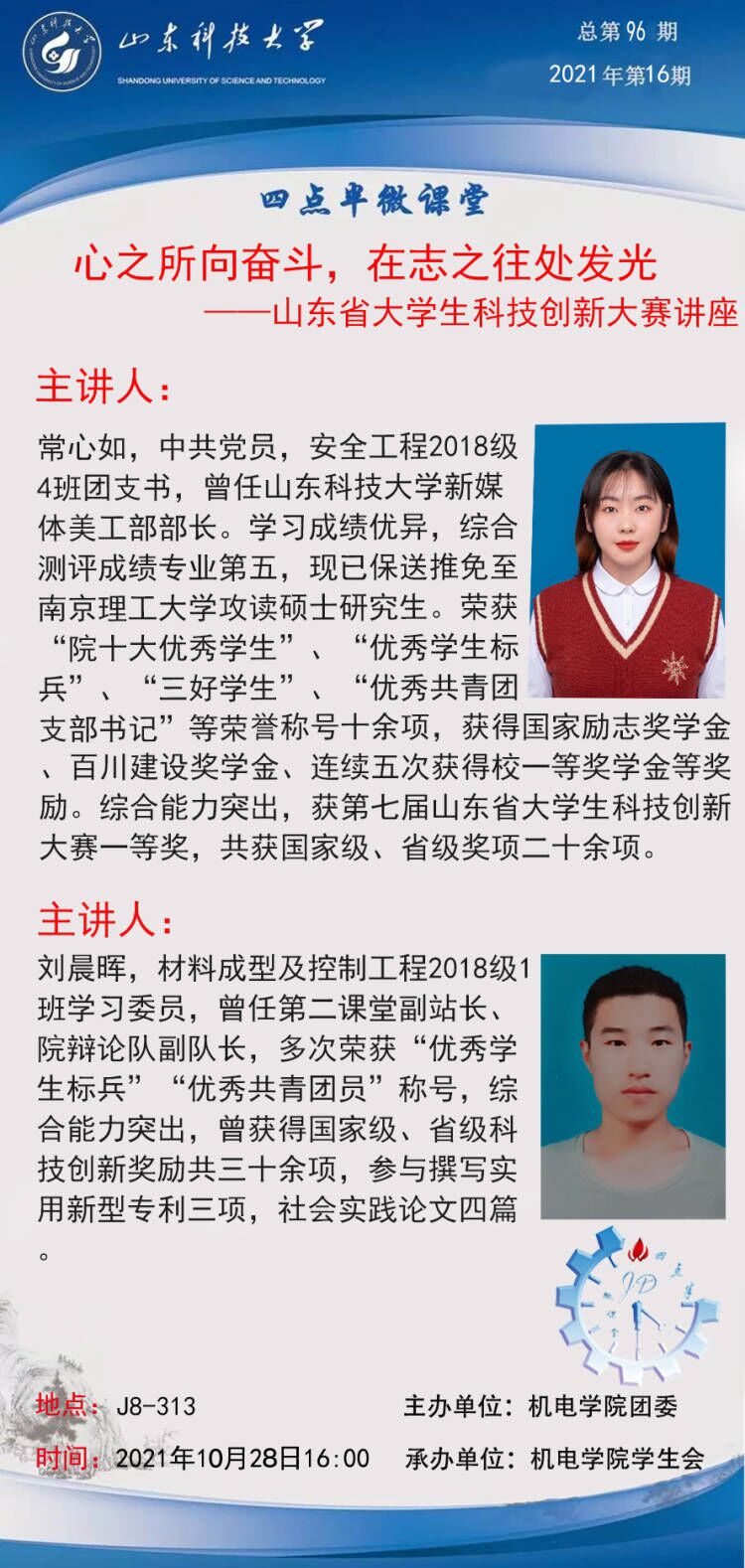点击:为了激发学生对科技创新的兴趣,提升参赛能力,10月28日下午,成人卡通 在j8-313举办了“心之所向奋斗,在志之往处发光”山东省大学生科技创新大赛讲座暨第95期四点半微课堂,安全学院安全18-4班团支书常心如、成人卡通 材料18-1班学习委员刘晨辉担任主讲人。