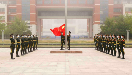 六点三十分,升旗仪式正式开始。国旗护卫队迈着矫健的步伐将国旗护送至升旗台,五星红旗伴随着国歌缓缓升起,沐浴在晨光中,随风飘扬,全体师生行注目礼。